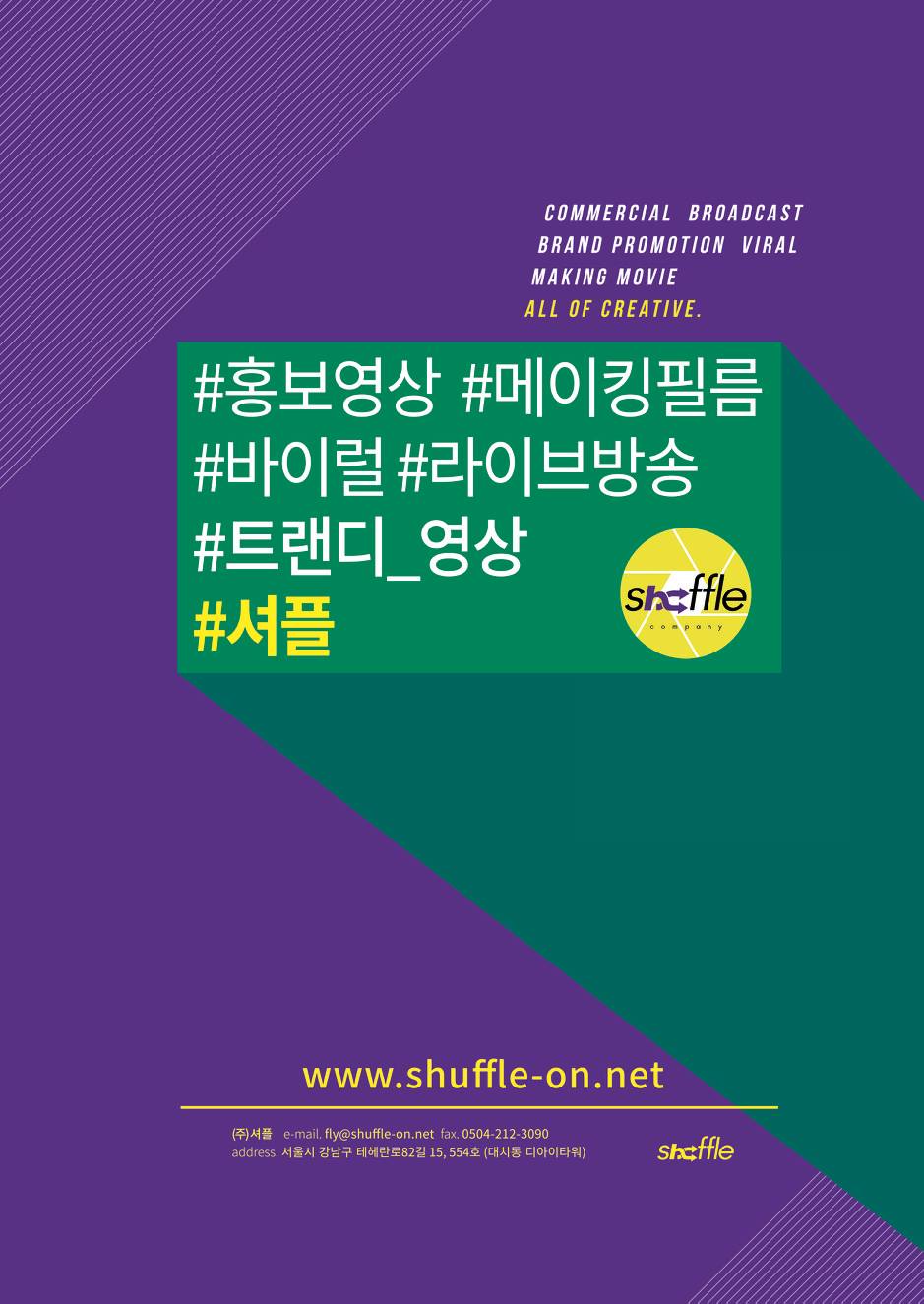 공중파 예능 PD가 작정하고 만드는 홍보영상 – 셔플(shuffle) ABOUT US 언제나 더 높은 퀄리티를 제공하는 미디어그룹 ‘셔플’입니다 KBS, SBS 등 공중파 프로그램에서 메인 팀장급 이상의 경력을 갖춘 PD들이 모인 영상 제작 컴퍼니입니다. 기획 단계부터 후반 마무리까지 물 흐르듯 효율적인 운영을 통해 시간과 비용을 낮추는 것은 물론 실제 방송국에서 사용되는 자체 제작 장비를 통해 하이 퀄리티의 영상을 보장해드립니다. KBS 뉴 로고송 스팟 – 제주소년 오연준 국토교통부 정책 홍보영상 – 신혼부부,청년 주거지원(Feat.김수미) 한국인터넷진흥원 보안네트워크 홍보영상 KBS 평창올림픽ID – 메인MC 편 지한솔 뮤비 티져영상 (30″ ver) NewKidd-소년이 사랑할 때 뮤직비디오 메이킹 뉴키드 크리스마스 광고 촬영장 메이킹-예능 포맷