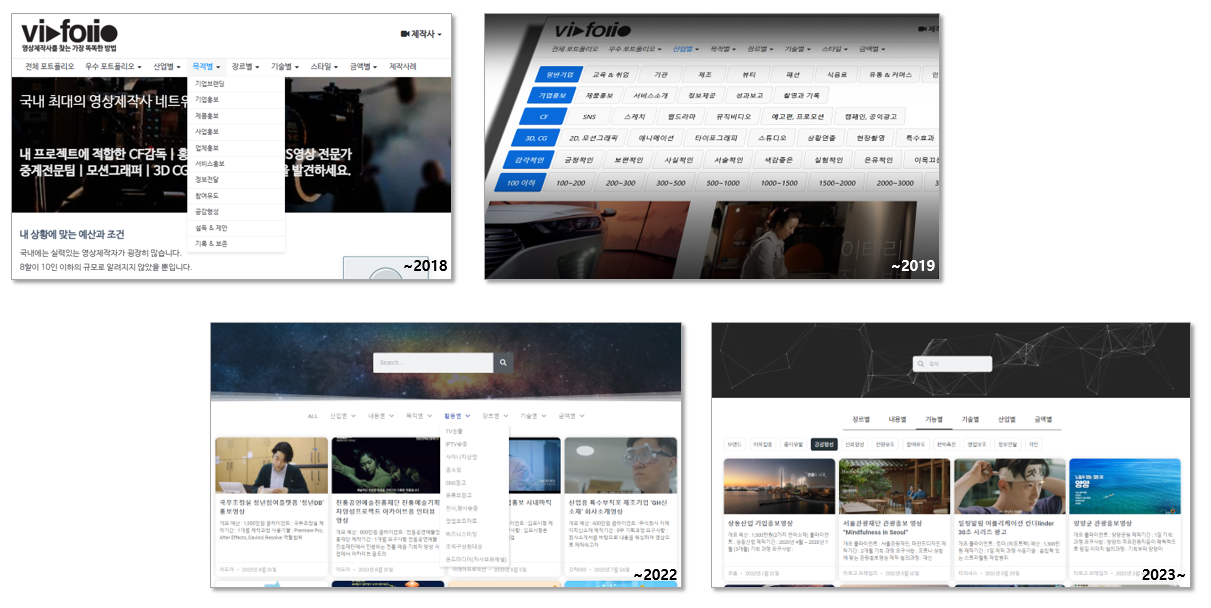 Category 갯수는 18년부터 53개, 68개, 77개, 93개, 110개, 93개로 변했는데요, 시대에 맞춰서 새롭게 제작되는 장르도 많아지고, 고객의 영상 활용 목적 또한 다양해지게 되어 카테고리 갯수는 증가하는 쪽으로 향합니다. 하지만 카테고리 갯수가 너무 많아지면 원하는 레퍼런스를 찾아내기가 오히려 불편해지기도 합니다. 사용성이 좋지 않은 카테고리와 분류체계는 폐기, 통합하면서 간소화시키고 있습니다.